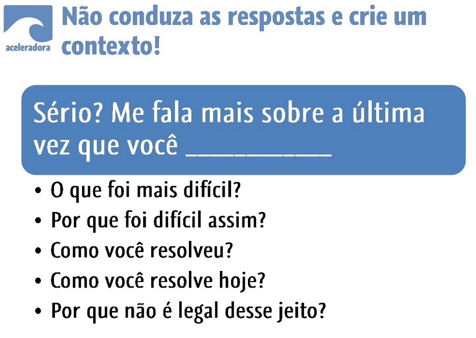 Evite falar sobre a sua solução ou o que ela faz. Fale sobre o PROBLEMA, sobre a “dor” do seu usuário, descubra como as pessoas resolvem isso, como elas lidam com a situação, como se sentem, o que funciona ou não atualmente nesse contexto e com isso pense quais lacunas você pode explorar ou melhorar.